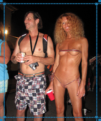 Topless babes show off big suntanned boobs & nipples at biker rally. Brunette on the left wears T shirt cut to uncover her entire breasts while her blond friend wears only bikini bottom.