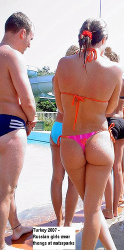 Topless girl wears string monokini bottom and an IPod on Miami Beach