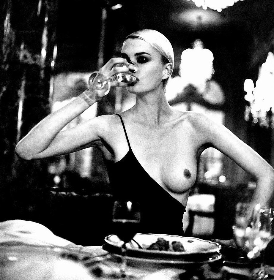 Beautiful blond wears see through lace top with no bra clearly showing her breasts and nipples. She has a warm confident smile showing she is totally comfortable being half naked for the camera.